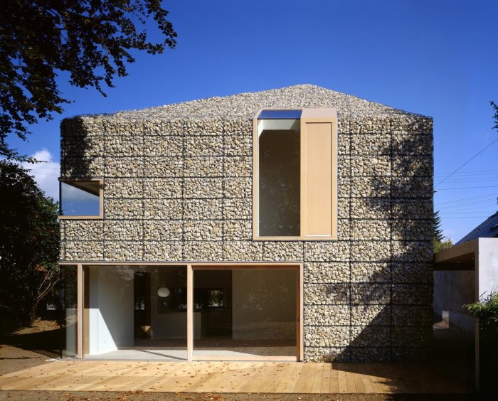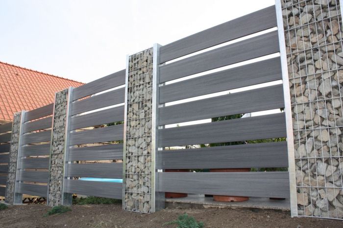 Даже традиционный забор из габионов выглядит нескучно и креативно.