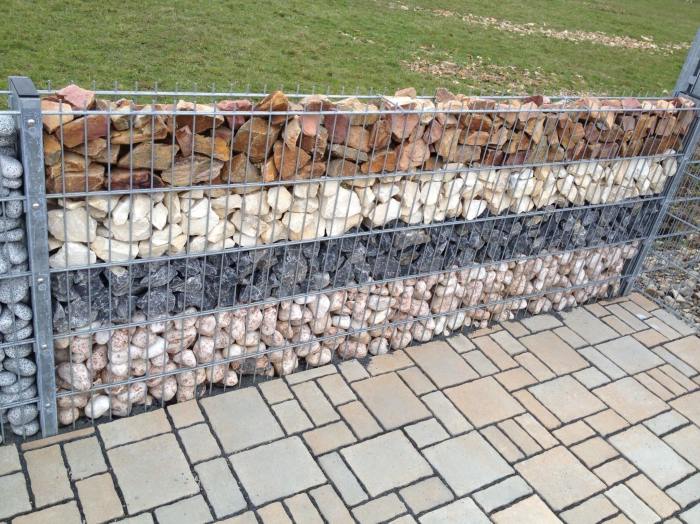 Габионные сетчатые изделия, заполненные разными породами натурального камня.