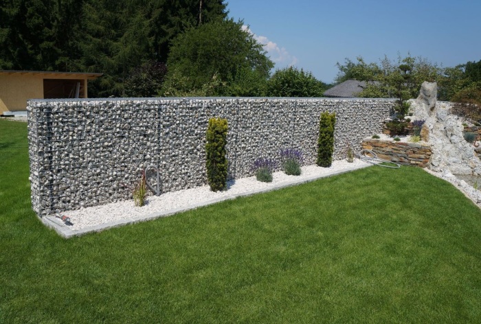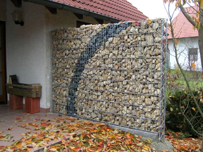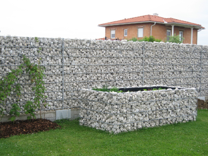 Простая, но эффективная конструкция габионов позволит скрыть приусадебной участок от посторонних глаз.