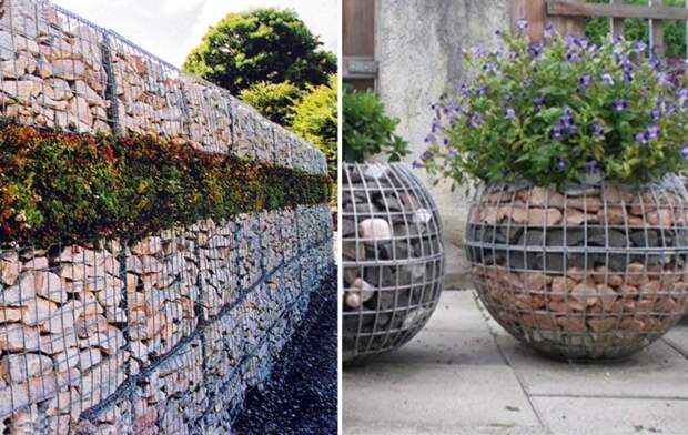 Габионы — ящики либо каркасы из металлической сетки, заполненные щебнем, галькой или камнями – нашли широкое применение в ландшафтном дизайне и строительстве. Используя их изготавливают уникальные конструкции для сада и приусадебного участка, и эту конструкции выполняют как декоративную, так и практическую функции. С их помощью своими руками можно изготовить — заборы, перегородки, лестницы, садовые камины, мангалы, кострище, цветочницы, клумбы, столы и скамейки, водопады, фонтаны и многое другое. В этом обзоре самые интересные идеи габионов, изготовить которые можно собственными руками.