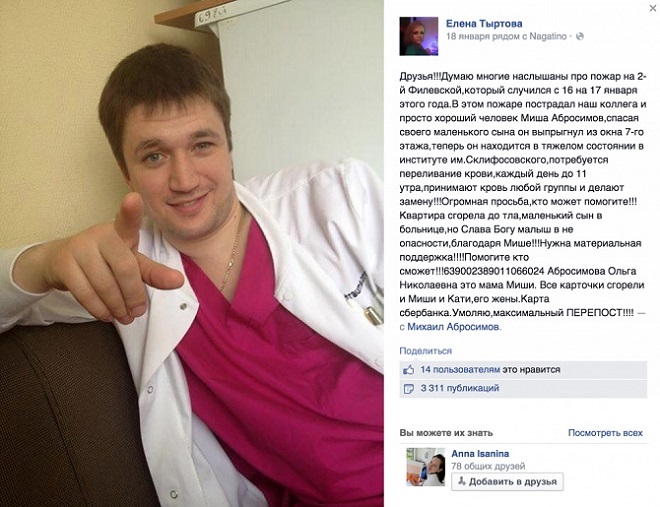 В ночь с 16-го на 17-ое января в Москве на 2-й Филевской улице, в квартире Михаила Абросимова, которая находится на 7-ом этаже, случился сильный пожар. Как только первые искорки пожара начали разгораться по всей квартире — мужчина сразу же учуял что-то неладное и поторопился в комнату, где его жена Катерина спала вместе с их четырехлетним сыном Арсением. Жена выбежала. Попавший через входную дверь воздух поспособствовал еще большему возгаранию. Михаил с сыном не могли выйти. Мужчина не сразу нашел сына, поскольку мальчик испугался и спрятался. Времени на раздумья практически не было. Оставалось одно — либо огонь и верная гибель, либо прыжок в окно и надежда на спасение.